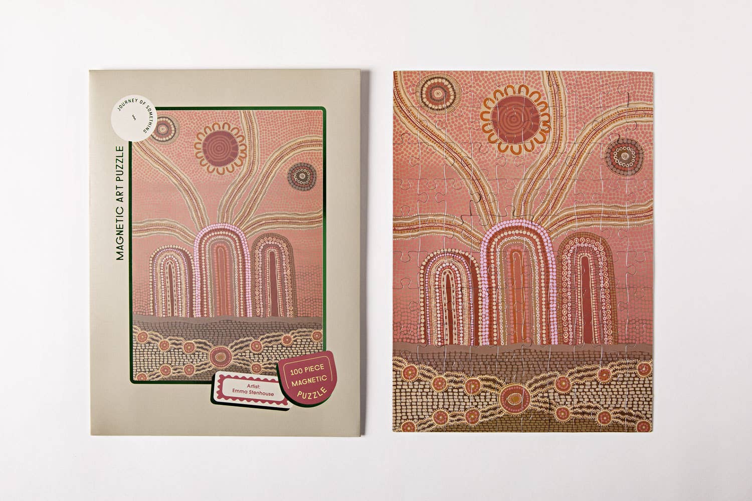 Keep this super cool, 100 piece magnet jigsaw puzzle on your fridge or anywhere that holds magnets. Chip away at this unique magnetic jigsaw puzzle every time you need a snack (and by snacks we mean wine). About the Artist Emma Stenhouse is a proud Ngarrindjeri woman, with strong links to the Gunditjmara people of Warrnambool. She would like to acknowledge the Traditional Owners of the land where this artwork was created, the Peek Whuurrong people of the Marr Nation, and pay her respects to their Elders, past, present and emerging. Emma recognises them and respects their cultural heritage, beliefs and relationship with the land, which is important to all of the Marr Nation people living today. Emma acknowledge the Elders of the Ngarrindjeri people who have given her support in her journey as she recognises who she is as a Ngarrindjeri woman and Artist. Additional Info 21cm x 29cm (finished size of puzzle)