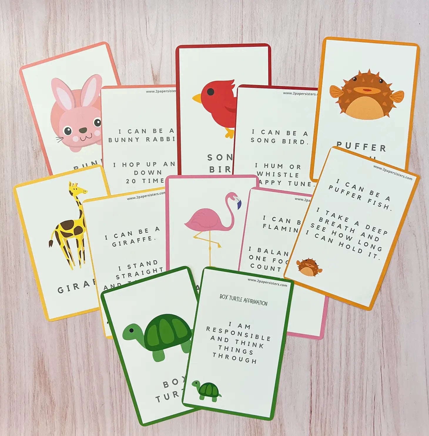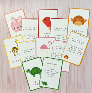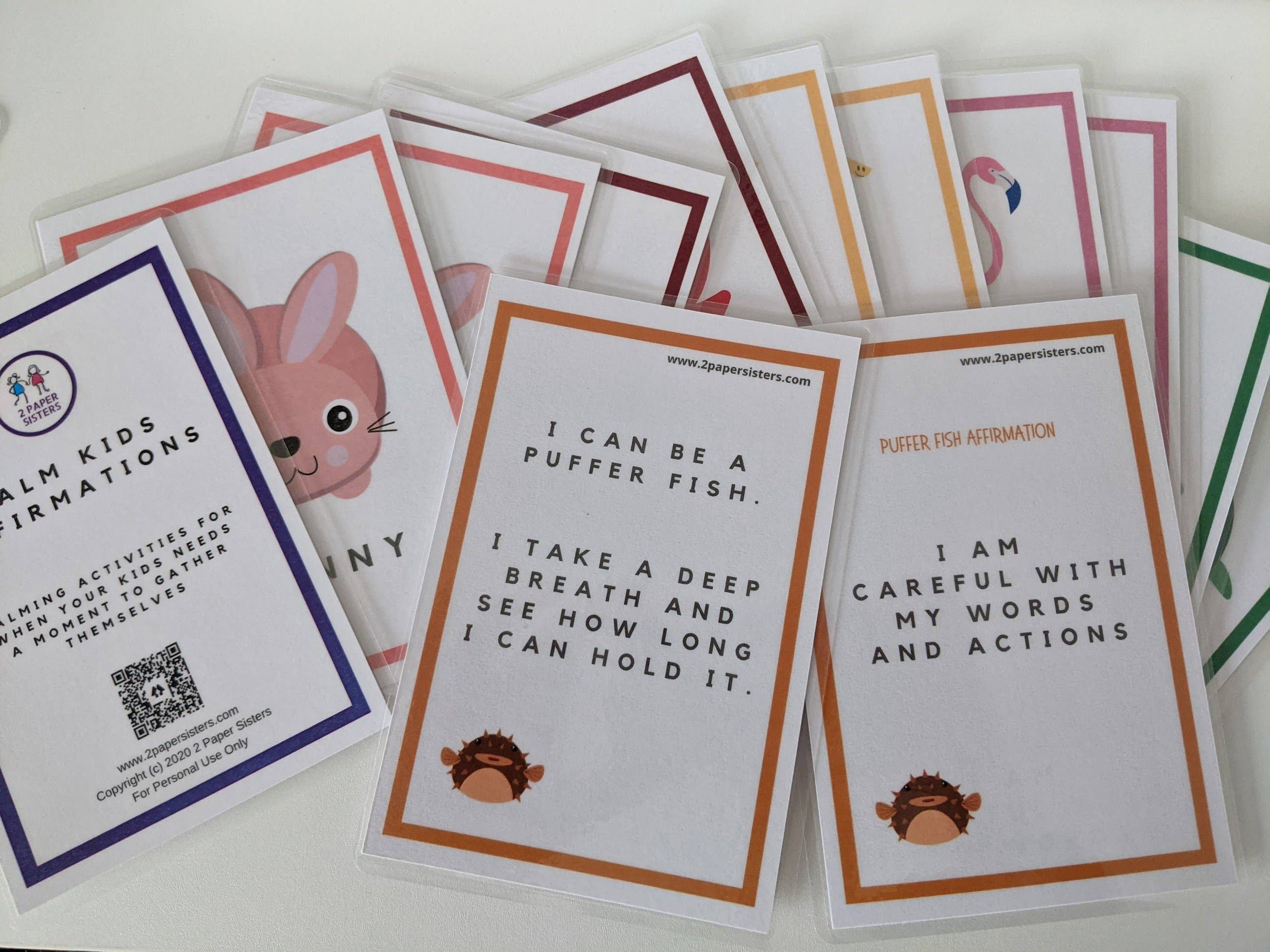 Help your kids manage their emotions with these Calm Kids card deck. Use the animal affirmation cards to reinforce the calming techniques. Place the cards in your calm down corner, invite your child select an animal and do the calming activity together, or invite your child to select an affirmation and read it together.