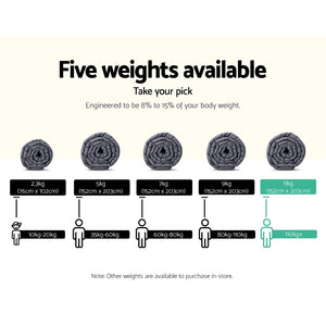 The science behind better sleep lies with a Giselle Bedding Weighted Blanket. It uses the therapeutic power of Deep Touch Pressure Simulation (DTPS) to stimulate pressure points throughout the body, thereby contributing to enhanced sleep, mood and relaxation. Our weighted blanket is engineered to be between 8% and 15% of your body weight to relax the nervous system by simulating the feeling of being hugged or held. This boosts serotonin and melatonin levels and decreases cortisol levels improving your heart rate and blood pressure. In short, you get healthier sleep and awake feeling refershed and re-invigorated. Made of 100% microfibre for both sides, the weighted blanket is filled with polyester and glass beads to create the right amount of pressure for a soothing hugging sensation. The weighted blanket is also close-fitting and conforms to your body shape and adapts to any sleeping posture easily. Not least, its excellent leak-proof stitching and 5-layer comfort ensures that the weighted blanket is ever so durable and comfortable with every use. The weighted blanket is machine washable for total convenience.