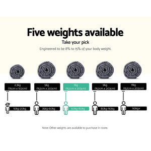 The science behind better sleep lies with a Giselle Bedding Weighted Blanket. It uses the therapeutic power of Deep Touch Pressure Simulation (DTPS) to stimulate pressure points throughout the body, thereby contributing to enhanced sleep, mood and relaxation. Our weighted blanket is engineered to be between 8% and 15% of your body weight to relax the nervous system by simulating the feeling of being hugged or held. This boosts serotonin and melatonin levels and decreases cortisol levels improving your heart rate and blood pressure. In short, you get healthier sleep and awake feeling refershed and re-invigorated. Made of 100% microfibre for both sides, the weighted blanket is filled with polyester and glass beads to create the right amount of pressure for a soothing hugging sensation. The weighted blanket is also close-fitting and conforms to your body shape and adapts to any sleeping posture easily. Not least, its excellent leak-proof stitching and 5-layer comfort ensures that the weighted blanket is ever so durable and comfortable with every use. The weighted blanket is machine washable for total convenience.
