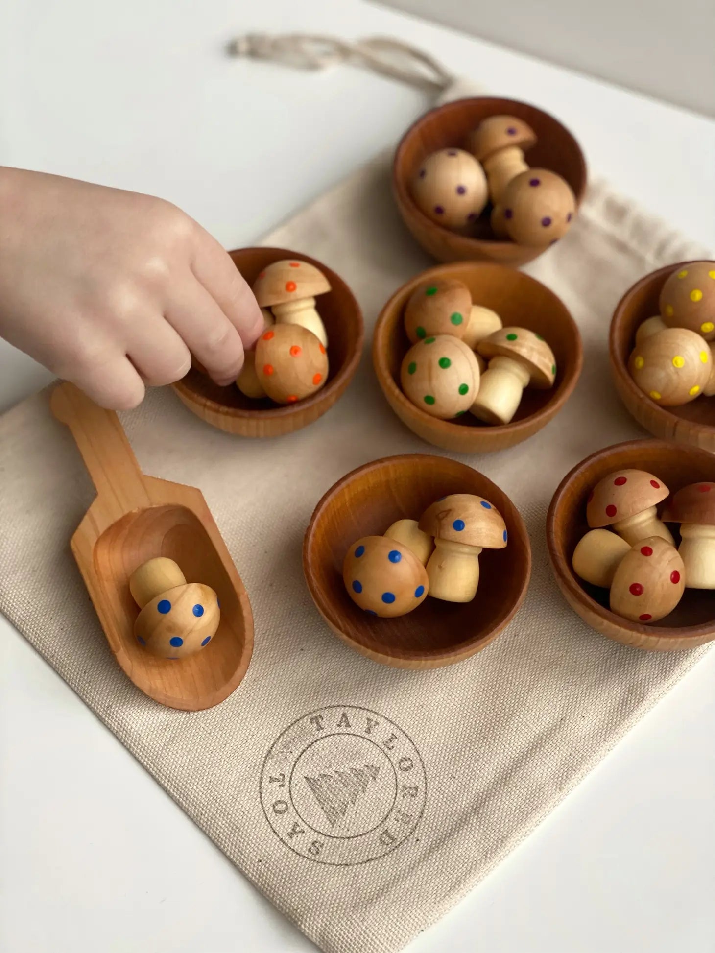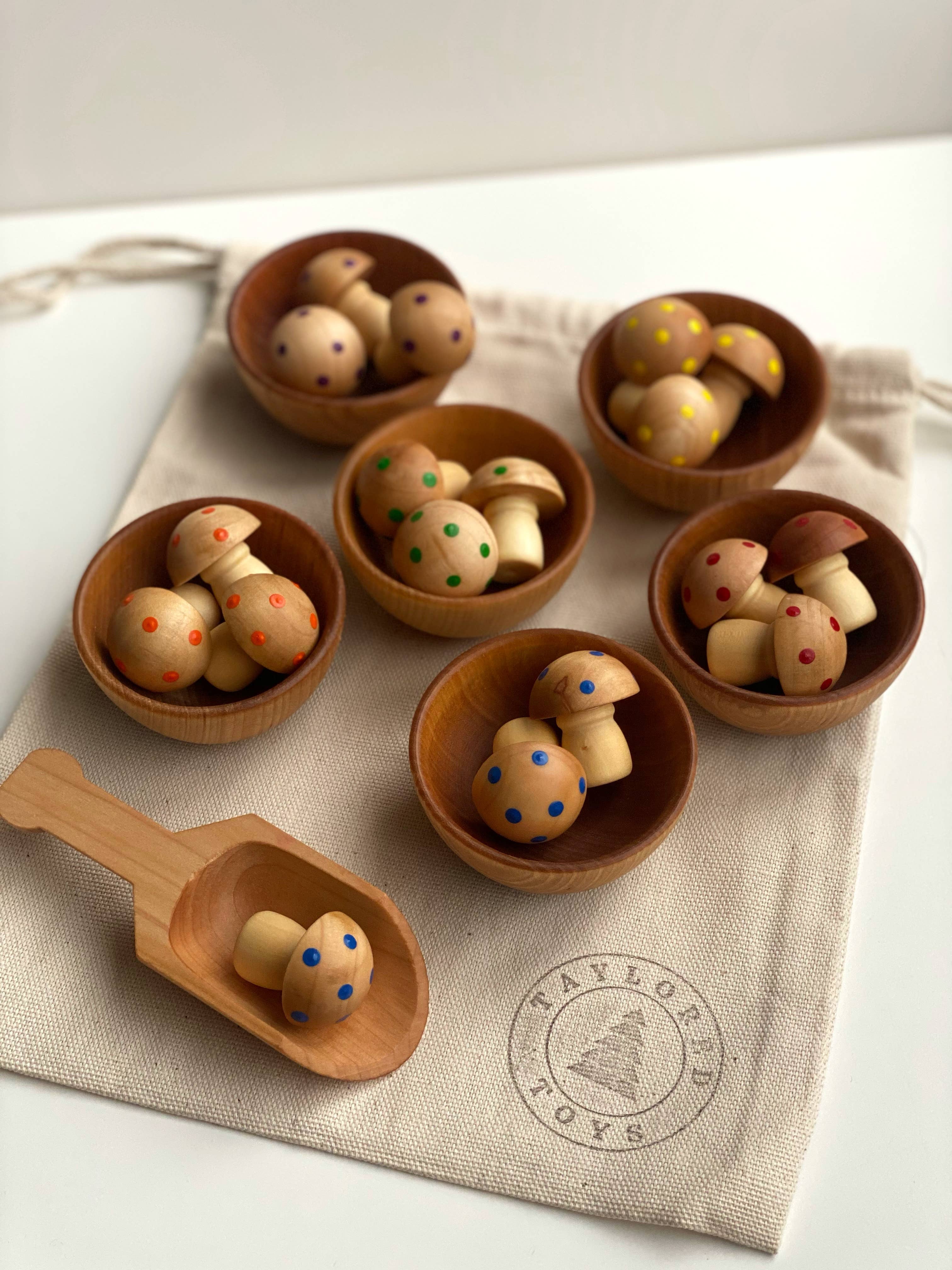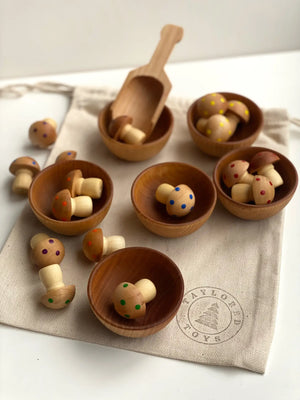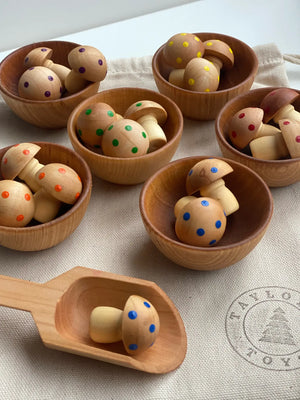 Painted mushrooms come with colorful dots (3 in each rainbow color). They are hand-painted by me using nontoxic acrylic paint, and are finished using food-grade mineral oil and beeswax to bring out the beautiful wood grain. Come with canvas drawstring bag for storage. Perfect open-ended toys for encouraging tactile play and exploration, and helps to develop skills such as counting, pouring, scooping, fine motor, creativity, and self-regulation.