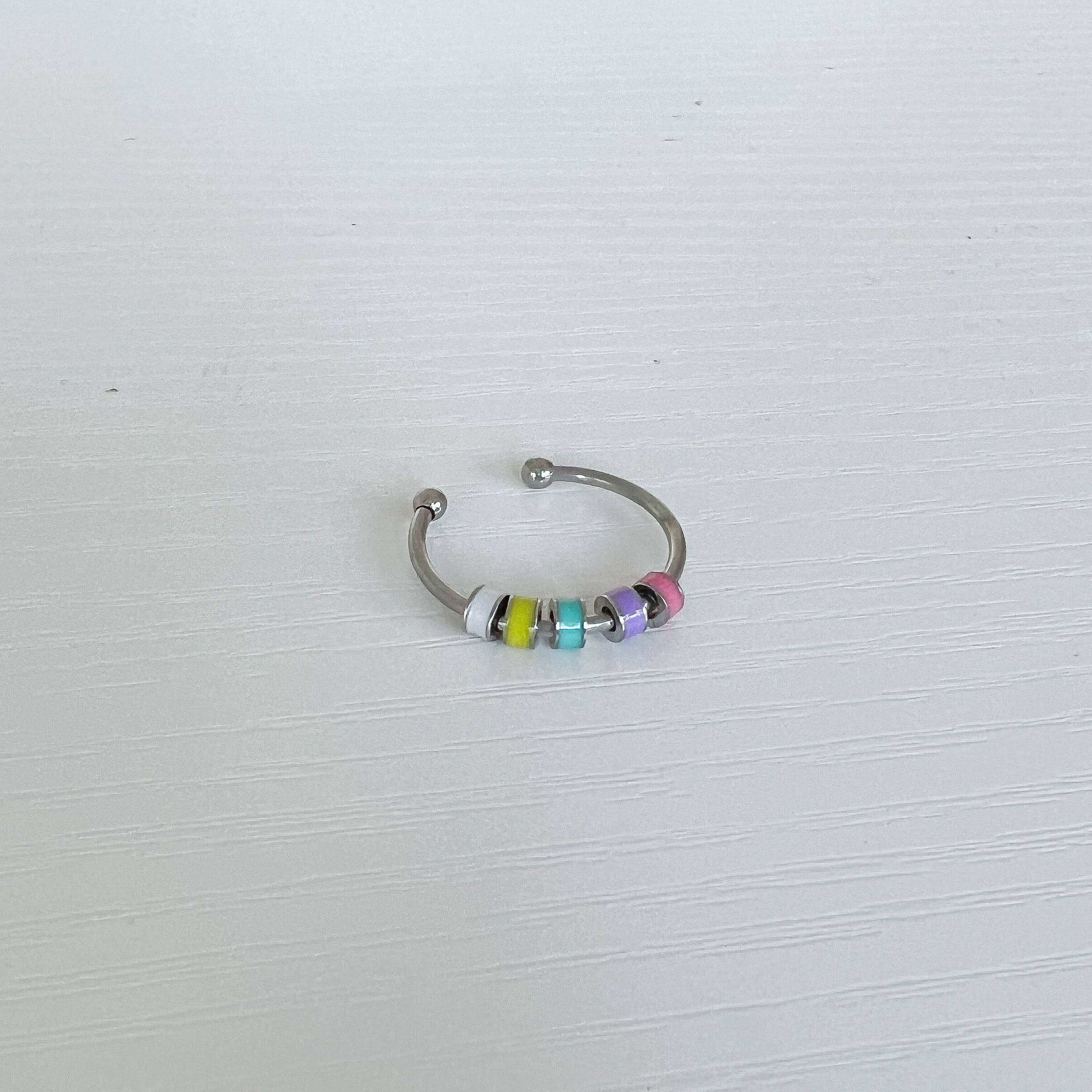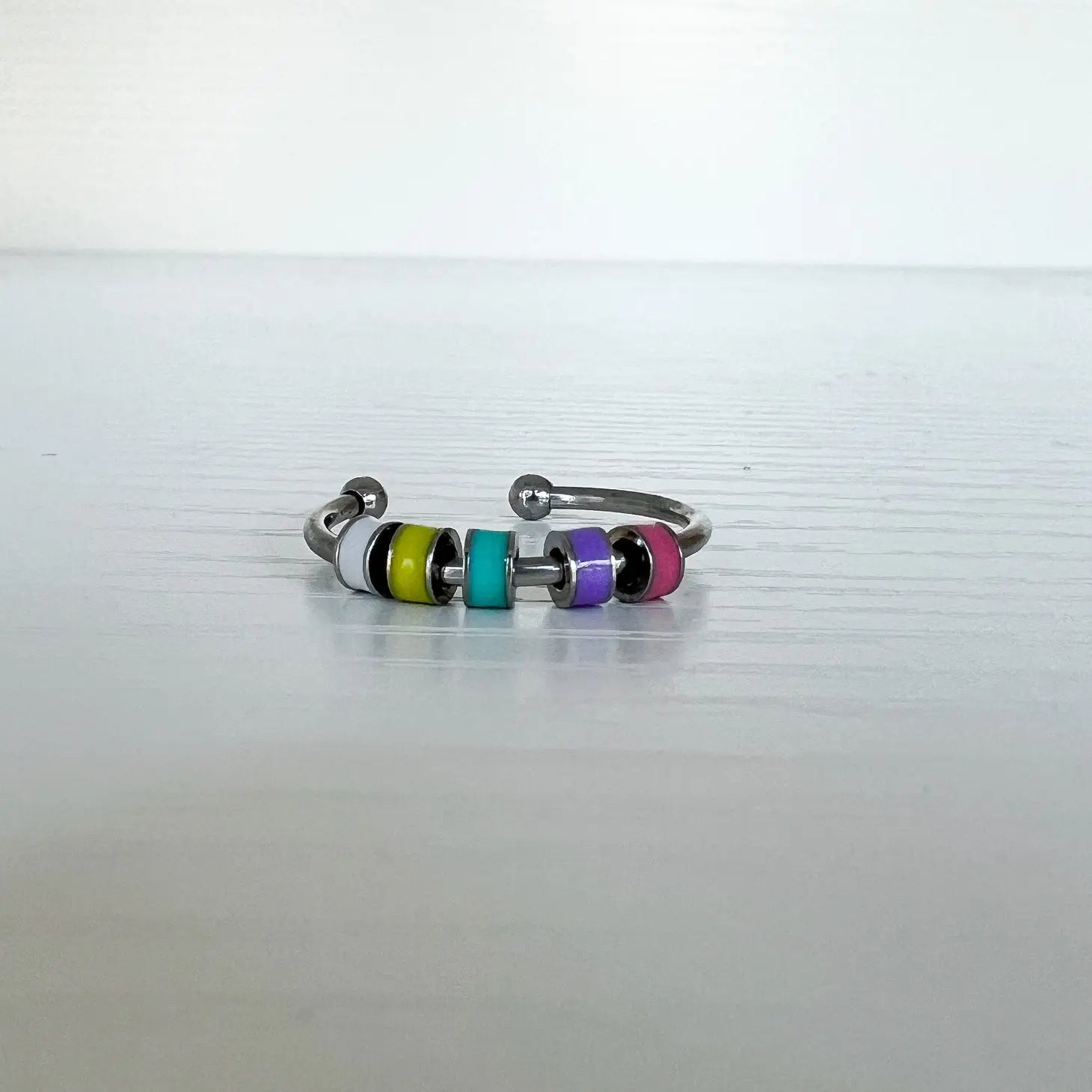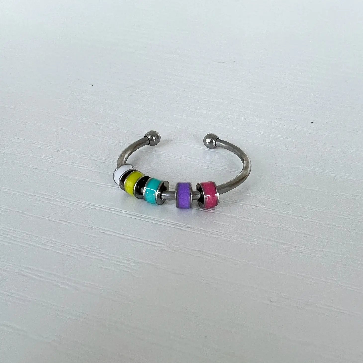 This adjustable rainbow fidget ring will help keep hands and mind at ease. Beads in white, yellow, aqua, purple and pink can be spun around the adjustable ring. A perfect, bold fit for all.