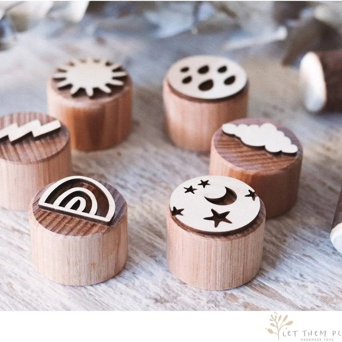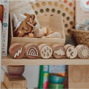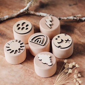 This Stampers Set is a wonderful tactile resource that adds a beautiful deep shape impression to all sorts of sensory materials like play dough, kinetic sand, or clay. This set contains 6 different WEATHER shapes on hand-cut Tasmanian Oak Rounds. They are made from marine-grade 3mm Australian plywood for the shapes to give water safe and deep shape impression. Each base piece is individually handcrafted from Australian Tasmanian Oak therefore the unique wood grains may vary slightly between items. Each stamp measures 43mm in diameter and approximately 30mm tall.
