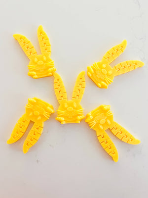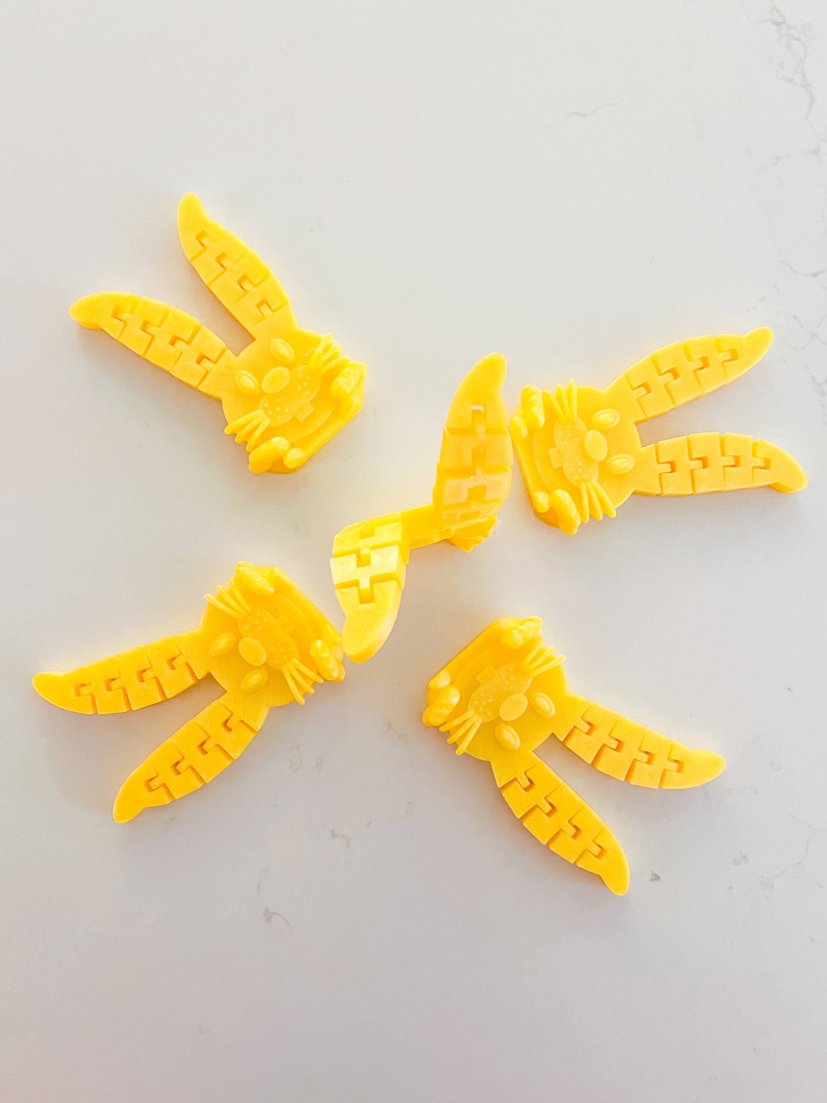Satisfy your fidgeting needs with this Bunny Fidget Toy! Cute and durable, its playful design adds a pop of color to your collection. Perfect for all ages, this quirky toy is sure to bring a smile to your face. (Warning: may cause excessive giggles!) These are a Yellow Glitter color. These are the easiest gifts to give, as fidgets are all the rage! These are made of Polylactic Acid. This is a recyclable, natural thermoplastic polyester that is derived from renewable resources such as corn starch or sugar cane. These will not come in individual packaging.